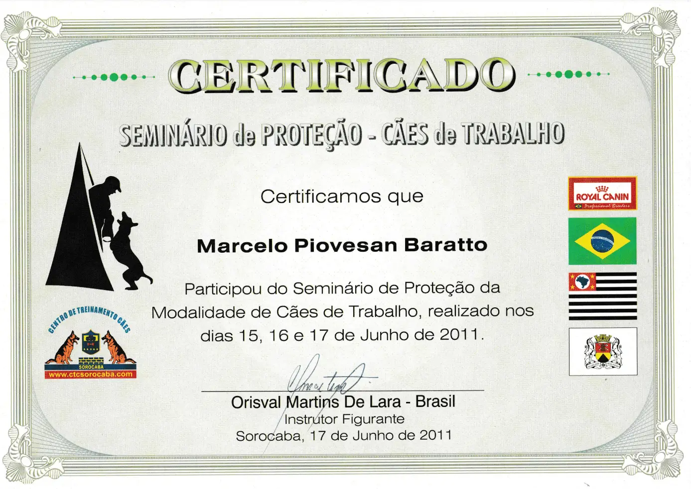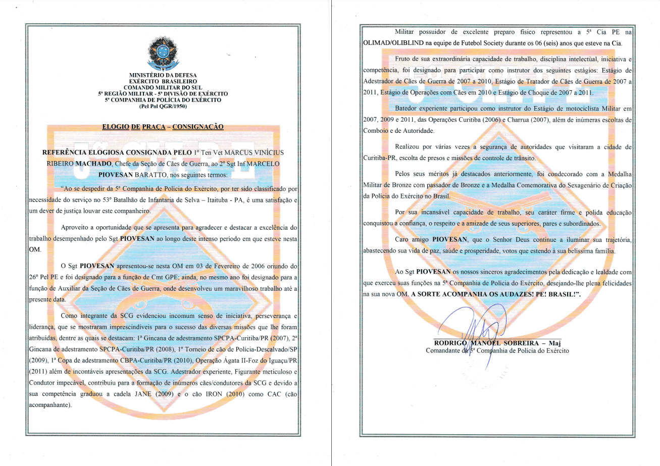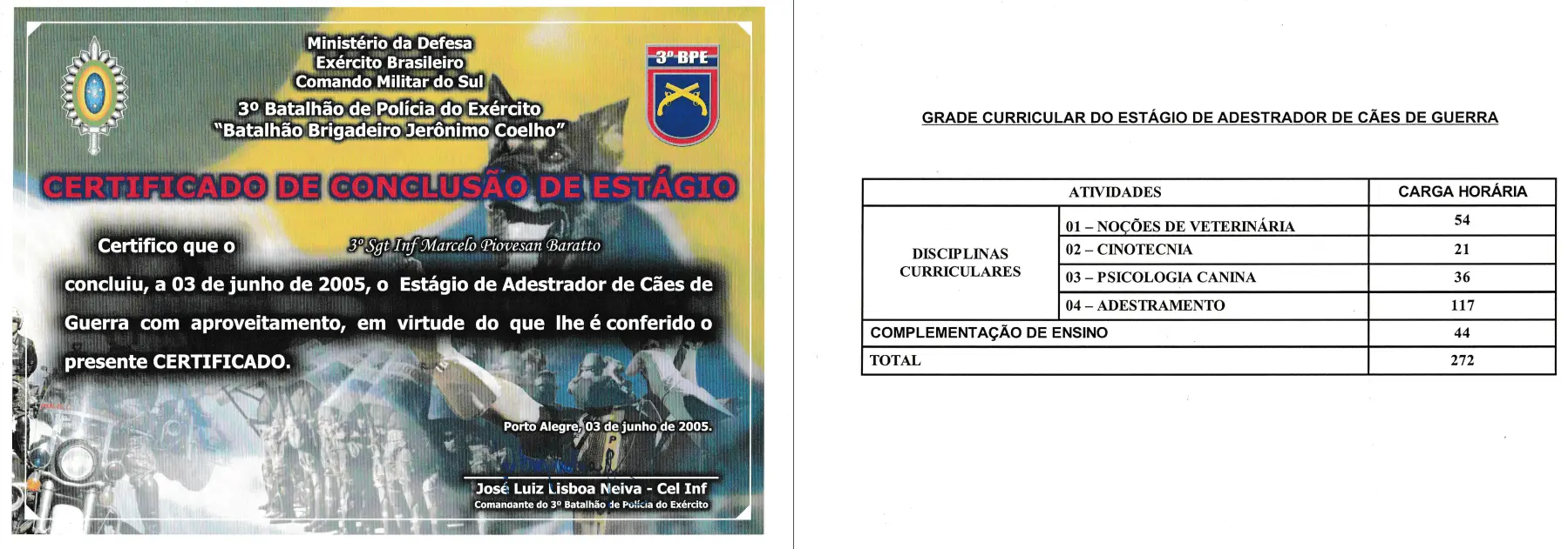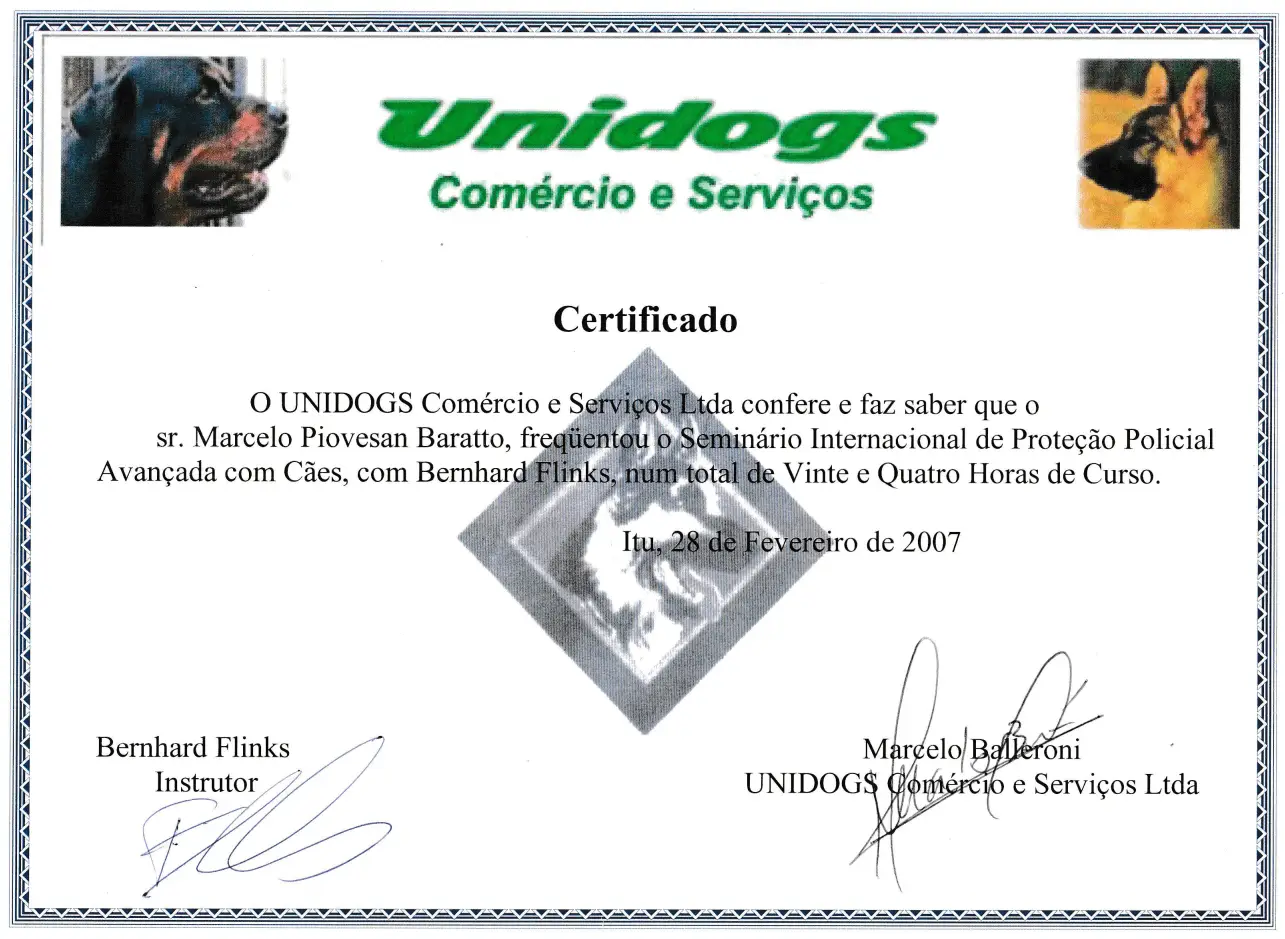 Durante 23 anos, treinei cães do Exército Brasileiro para atividades policiais, de faro e de proteção, participando de cursos e seminários com instrutores do Brasil, Alemanha e Bélgica. Atuei como instrutor na formação de dezenas de condutores e adestradores, compartilhando conhecimento técnico de alto nível.