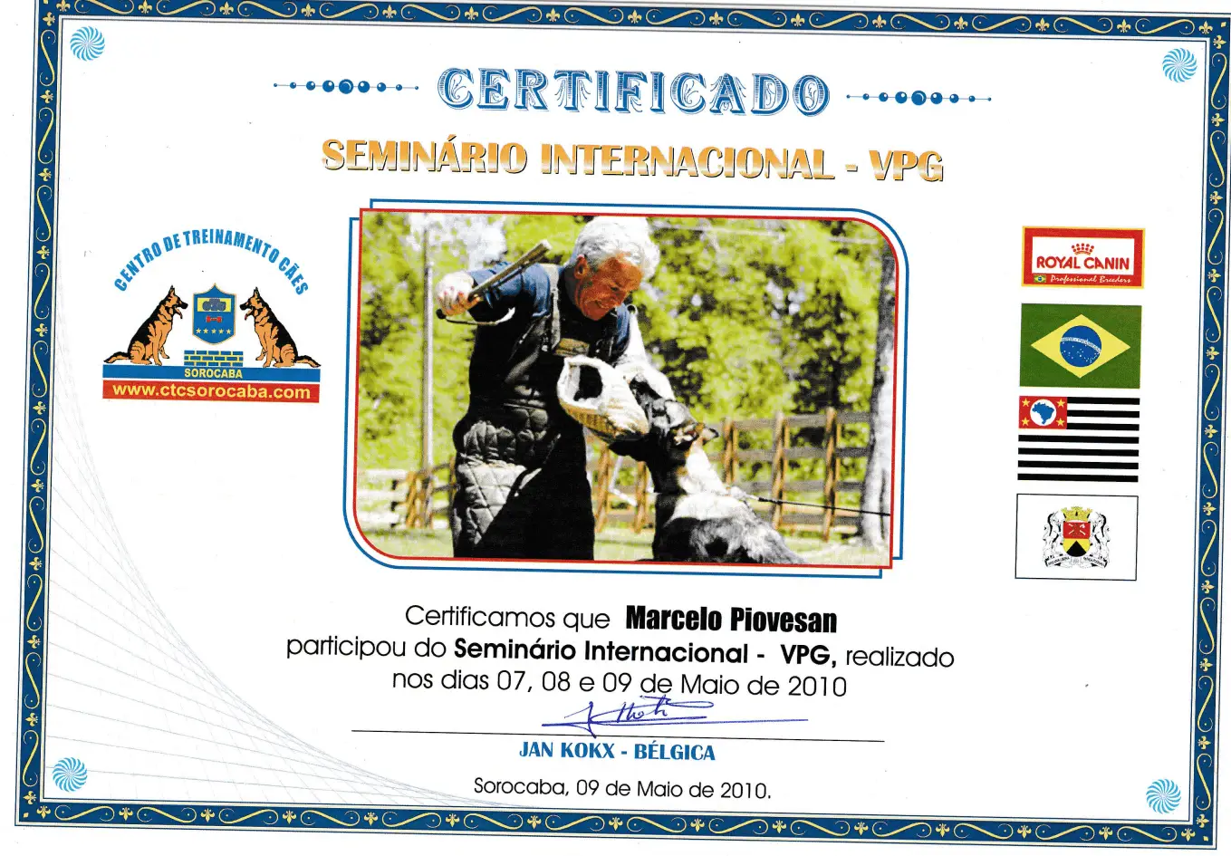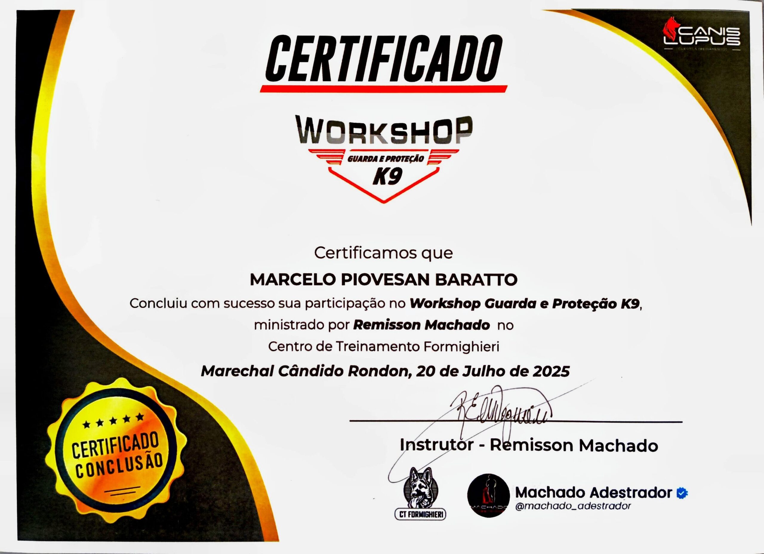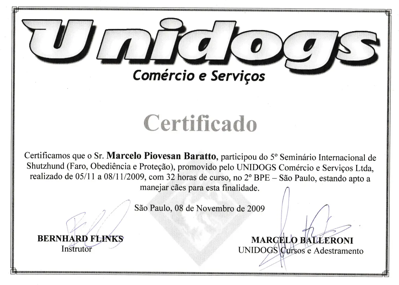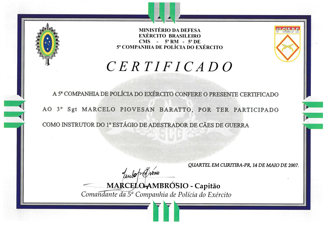 Durante 23 anos, treinei cães do Exército Brasileiro para atividades policiais, de faro e de proteção, participando de cursos e seminários com instrutores do Brasil, Alemanha e Bélgica. Atuei como instrutor na formação de dezenas de condutores e adestradores, compartilhando conhecimento técnico de alto nível.